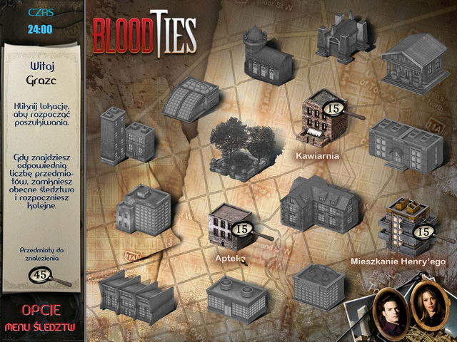 Zasmakuj intrygującej przygody pełnej ukrytych obiektów w grze zainspirowanej telewizyjnym przebojem. Pomóż Vicki Nelson, prywatnej detektyw, rozwiązać sprawę zagadkowych zaginięć. Czy nękające miasto zniknięcia mają jakiś związek z tajemnym zgromadzeniem? Vicki jest o tym przekonana! Dołącz do niej, i wraz z Henrym (450 letnim wampirem!) i asystentką Coreen, rozpocznij dochodzenie, badając szczegółowo dopracowane lokacje. Odkryj mroczne tajemnice mistycznej koterii. Odszukaj setki mistrzowsko ukrytych wskazówek w każdej z lokacji i pomóż Vicki rozwiązać zagadkę zanim będzie za późno! Zanurz się we wciągających poziomach, intrygującej fabule i ciesz się niezliczonymi godzinami inteligentnej rozgrywki. Więzy krwi to oryginalna opowieść, która do końca utrzyma cię w niepewności.