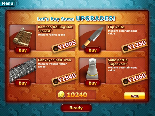 W grze tej wcielasz się w szefa restauracji serwującej Sushi. Twoim zadaniem jest obsługa klientów - jak najszybsza realizacja zamówień złożonych przez głodnych klientów. Aby przyciągnąć większą ilość koneserów sushi i uzyskać jak najwyższy zysk ucz się nowych receptur, dekoruj i rozbudowuj restauracje o nowe urządzenia.